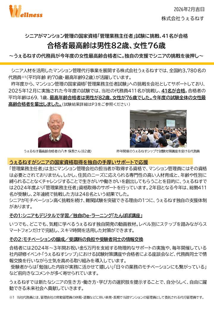 昨年度から、マンション管理の国家資格「管理業務主任者試験」への挑戦を会社としてサポートしており、2025年12月に実施された今年度の試験では、当社の代務員411名が挑戦し、41名が合格。合格者の平均年齢は69.1歳、最高年齢合格者は男性が82歳、女性が76歳でした。今年度の試験全体の女性最高齢合格者を輩出しました。